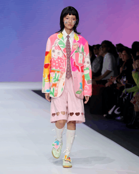The collection makes use of an eclectic range of fabrics, including different styles of patchwork vintage handkerchiefs, crochet fabric, blankets, printed mesh fabric and tapestries woven with Han’s illustrations.