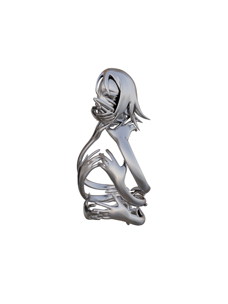 “未來是一種對過往揮之不去的反思。過去的行為,有發生過的,都會在我們的「現在」種下長長的影子。然而,在這黑暗之中,卻潛藏著一種緊迫的渴望,想要把握未來——這往往是一種沉重的負擔,像是被拖回,仿若被不確定性蒙住了雙眼,抱著自己的手臂和被勒着面孔的動作,正正確立了這種不安,反映了我們在面對未知時的焦慮。”