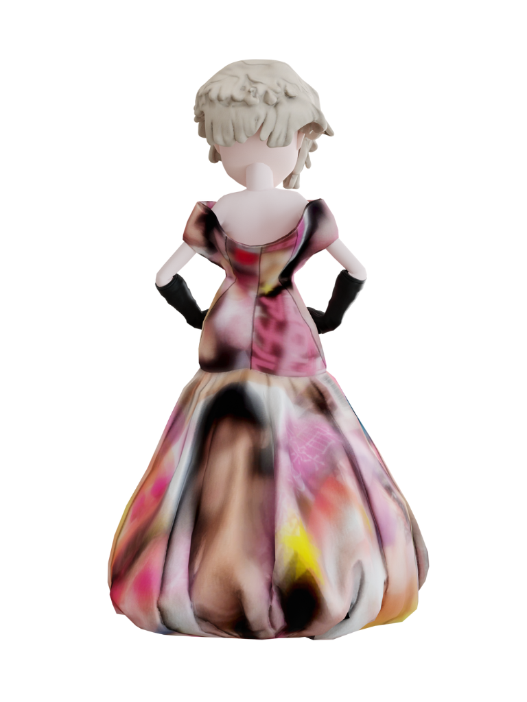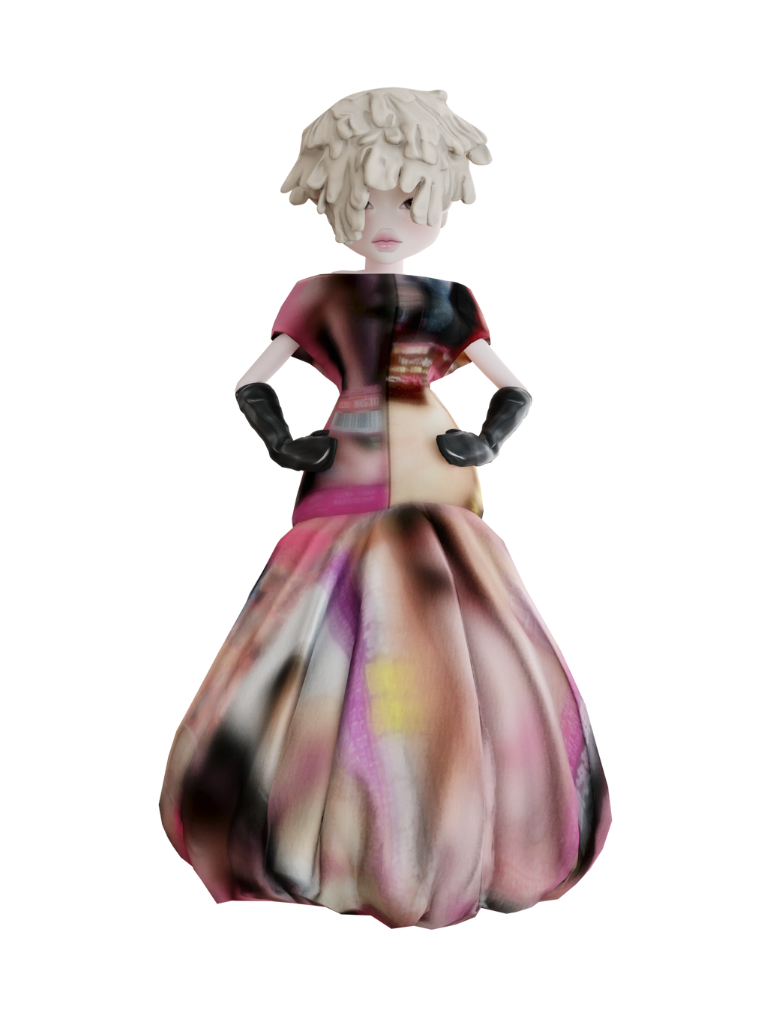 The collection “Bior” employs bootleg design techniques to merge haute couture tailoring with the raw aesthetics of grassroots life. It reimagines fan covers as ornate hats, mimics the texture of plastic bags, and incorporates the clashing colours of neon lights. The gown creates a blurred, luminous effect through prints of varied materials, evoking the glare of neon-lit nightclub signage. With deconstructed tailoring and exaggerated proportions, the designs capture laborers’ emotional tensions, expressing both the desolation and vitality of street life. Through this satirical yet profound fashion language, Bior reveals the exclusion of grassroots laborers from fashion narratives, reconstructing traces of their existence within high fashion’s visual vocabulary.