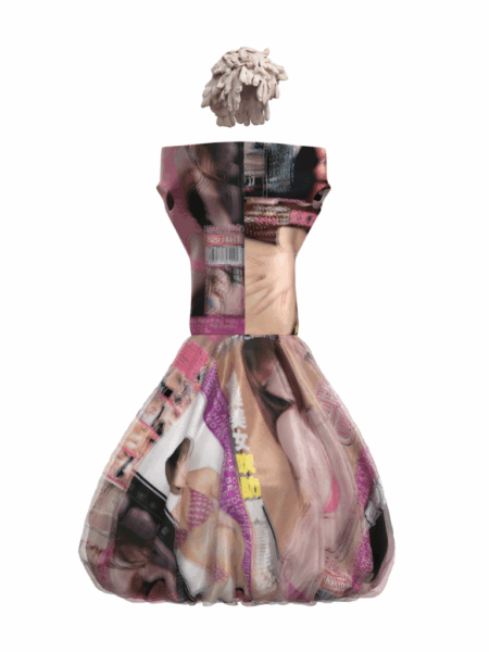 The collection “Bior” employs bootleg design techniques to merge haute couture tailoring with the raw aesthetics of grassroots life. It reimagines fan covers as ornate hats, mimics the texture of plastic bags, and incorporates the clashing colours of neon lights. The gown creates a blurred, luminous effect through prints of varied materials, evoking the glare of neon-lit nightclub signage. With deconstructed tailoring and exaggerated proportions, the designs capture laborers’ emotional tensions, expressing both the desolation and vitality of street life. Through this satirical yet profound fashion language, Bior reveals the exclusion of grassroots laborers from fashion narratives, reconstructing traces of their existence within high fashion’s visual vocabulary.